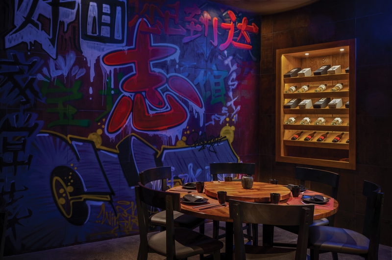 Inside, walk through an alleyway with a slightly undulating floor with walled yards, a dragon overhead, garage spaces, bikes stored between dining spaces, an intimate bar, and graphics and graffiti adorning the walls.