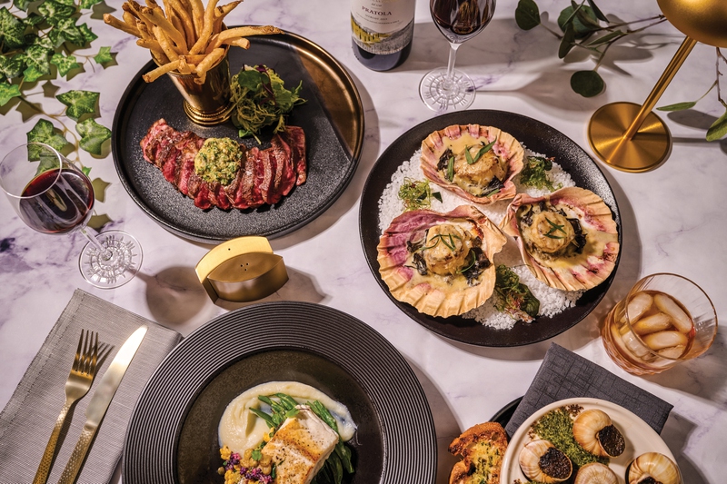 Familiar bites like sea scallops are served up gratinée-style with vermouth cream and sorrel and mushroom duxelles; steak frites is a French classic served with duck fat fries, maître d’ butter and watercress; and the Alaskan halibut comes with brown butter, capers, cauliflower, golden raisins, lemon and haricot verts.