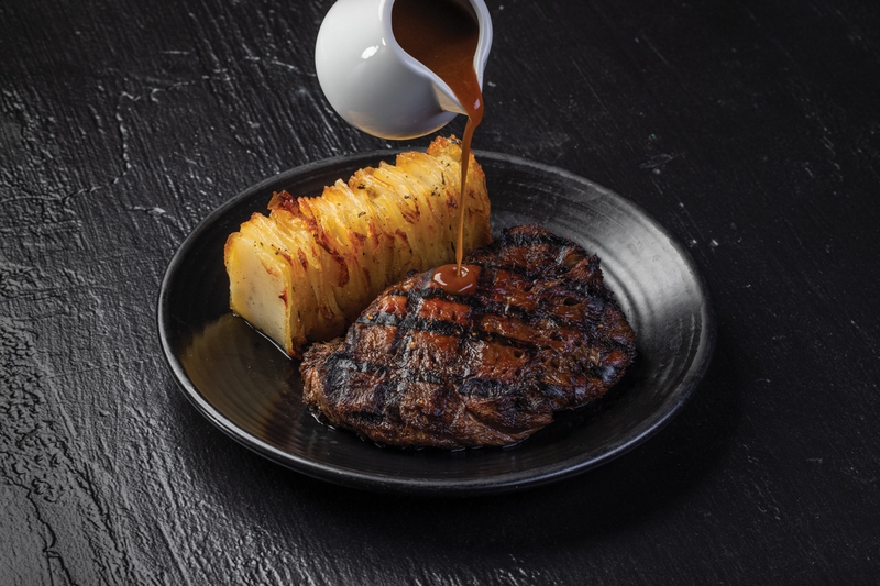 Entrées include options like eggplant filet with mashed potatoes and a mushroom bordelaise, a meaty-looking version with a huge punch of flavor. Similarly, the grilled lion’s mane steak has a very wild look and texture, also with mushroom bordelaise. It’s served with signature truffle potatoes, slices with fresh shaved Parmesan and thyme—so fragrant. Another side dish that is worth every penny is the roasted Japanese eggplant. Those slender boats are accented with lemon yogurt, cherry-harissa chutney and mint.