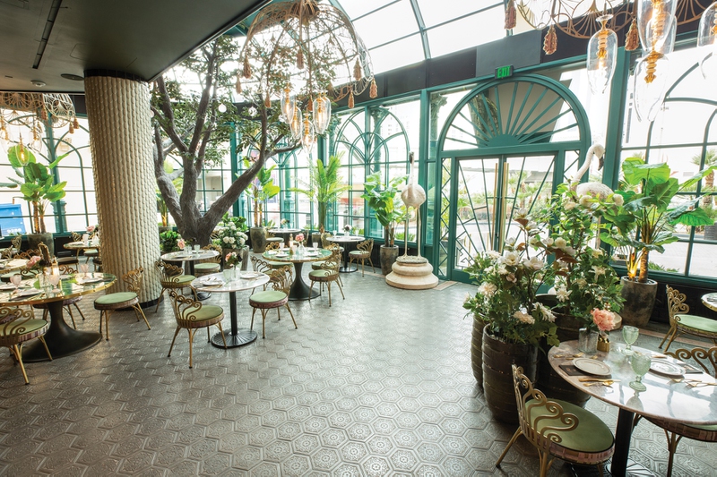 Upon stepping through the striking green gates that create a portal to this opulent venue, you’ll notice the space has been designed with keen attention to detail. Lush greenery fills the atrium-like area by the Stripside entrance, while plush pinks accent the stunning gold hues found throughout the rest of the splendid space. Part of what makes this bar so visually interesting are the various textures throughout. Fuzzy wallpaper, scaled tiles, ostrich feathers—it all just feels oh-so-extravagant.