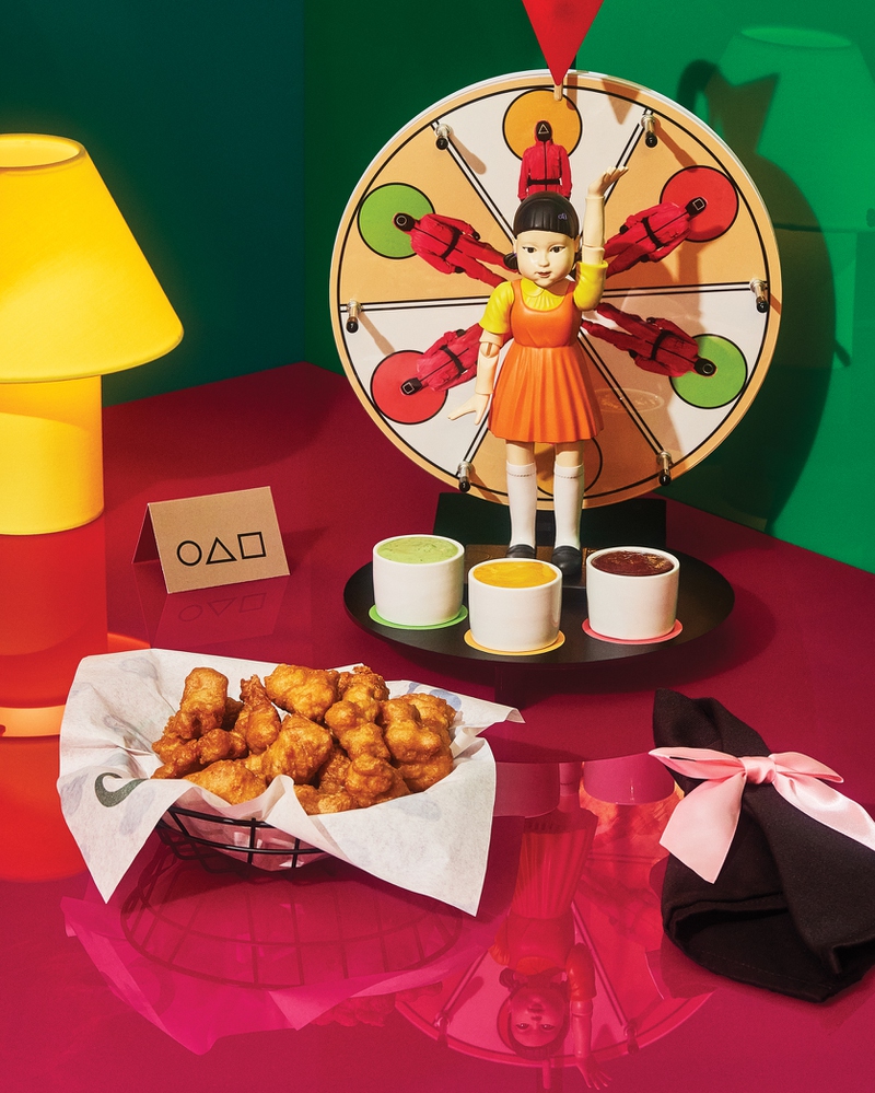 Some would arguably say that Squid Games is the most popular Netflix show, and fans are in luck with interactive bites and sips based on the Korean thriller. Start with the dessertlike cocktail Dalgona Rum Buzz, a mix of Bacardi Superior rum, Myers’s Original Dark rum, Frangelico, honey, oat milk and a unique coffee foam. The garnish is, you guessed it, inspired by the dalgona game episode, and features a honeycomb candy with a shape stamped into the treat waiting for you to play the game and remove it without breaking it into pieces. Play another game when you order the Red Bite, Green Bite—spin the wheel and let fate decide which sauce you’ll dip your fried chicken into.