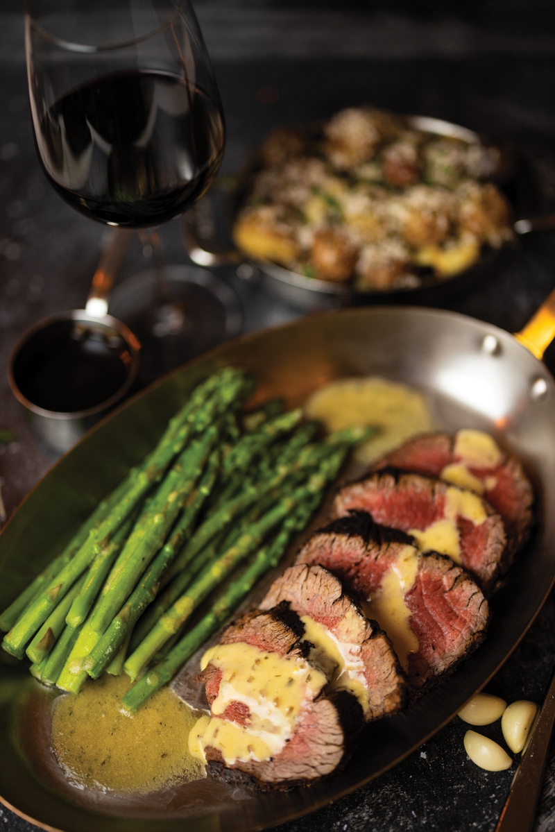 For the perfect meal for two, this 20-ounce Creekstone Farms Angus steak (a center-cut beef tenderloin roast) is hard to beat. Emeril Lagasse’s grilled and oh-so-tender version pairs it with fondant potatoes, local mushrooms and sauces that only accentuate its wonderful flavor.