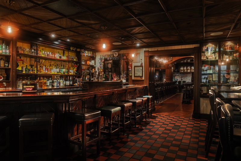 Much of the interior has been reclaimed from Ireland and reconstructed here by Irish craftsmen. Almost like a museum exhibit is the shop bar (although museum exhibits wouldn’t have the good folk drinking and eating inside), a petite space with benches, tables and the original bar from co-founder Cairan Sheehan’s grandfather’s pub, founded in the 1880s and rebuilt in the 1920s after a fire. That’s just the start of several more ornate bars and rooms, from the Victorian Room, with a bar top of Kilkenny limestone, a statue of St. Patrick, a gorgeous floor made by the same company that worked on the Titanic, and a huge set of antique cabinets that house an enormous whiskey collection; the Theater Room, with an impressive bar backed by huge mirrors rescued from the Olympia Theatre in Dublin; and the Living Room, designed as a typical 1970s Irish living room (with a cute little bar). And all over the walls, you’ll find photos and memorabilia.
