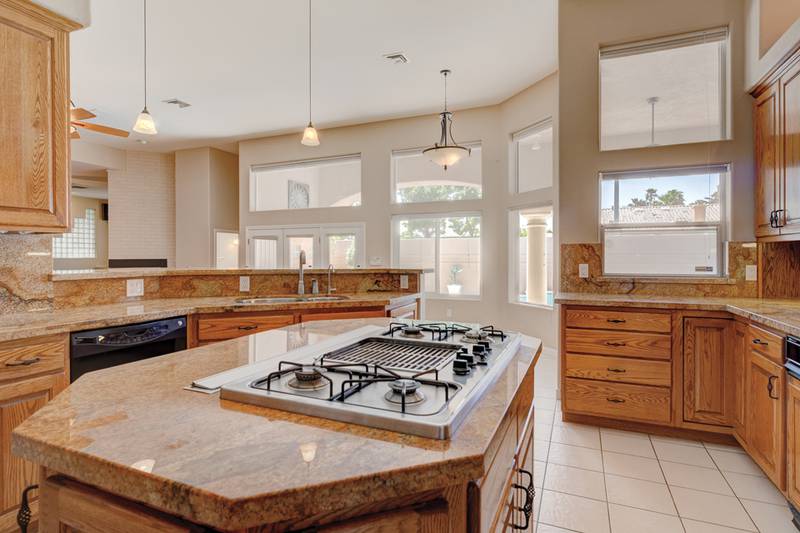 The 3,979-square-foot property in Vegas’ Las Quintas neighborhood and listed by Allen Zeller with Berkshire Hathaway HomeServices Nevada Properties, makes you feel at home from the minute you arrive, with its circular driveway, four-car, air-conditioned garage with separate entry into the guest side of the house. And it’s hard to not be impressed, with the tall ceilings beckoning you to come in and experience all the home has to offer.