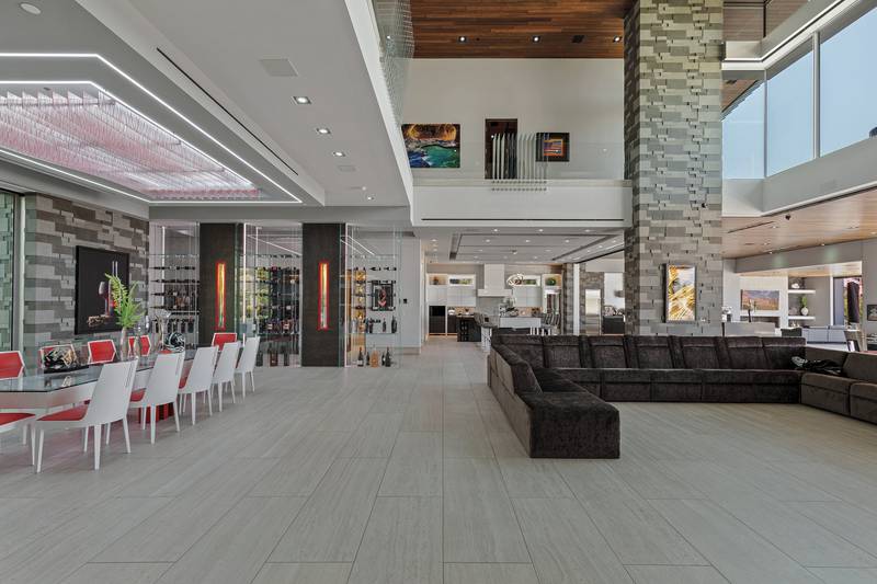 This 14,207-square-foot home, listed by the Ivan Sher Group of Berkshire Hathaway HomeServices Nevada Properties, is a sprawling estate, consisting of three stories, four bedrooms, nine bathrooms and three climate-controlled garages that can accommodate up to 12 vehicles. In addition, there’s a car lift that brings the vehicle directly to the second-floor owner’s suite.