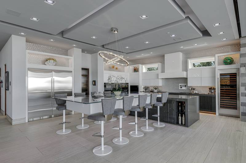 Feel like cooking? Take your pick of either an indoor or outdoor kitchen—both feature induction cooktops and Sub-Zero refrigerators, and the outdoor kitchen has a teppanyaki table, ice cream machine and pizza oven. The 14-foot cantilevered island will impress any guest.