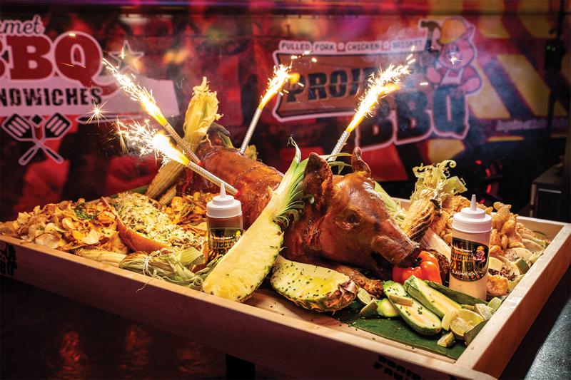 This restaurant is just a cool place to hang. Project BBQ is situated right along the Fremont Street Experience and features a permanent food truck where guests can order some of the best Carolina barbecue and all the fixings. The picnic-style dining area offers high-top tables where guests can stand up and eat while enjoying all the people-watching action. For a real memorable experience, we suggest ordering Project BBQ’s gigantic Hogstravaganza Platter. (Tip: This is for a large, hungry group). The platter is delivered to your table with lit sparklers. On the platter is a whole roasted pig, Project crackling skins and chips, a whole pineapple, corn on the cob, zucchini, bell peppers, roasted potatoes, coleslaw, limes, a variety of sauces and the Hundred $$Dollar$$ Sandwich (which you can also order on its own). The 2-foot-long sandwich is piled with brisket, pork and chicken with BBQ sauce, beer and cheese sauce, bacon bits and Project chips.