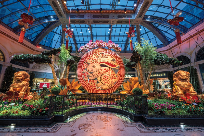 The meal comes with an incomparable view of the 32-foot-tall Year of the Water Rabbit sculpted medallion in the West Bed (the hero piece of the display sentried by twin bonsai trees) that reflects the rippling waters beneath it at night. Intricately crafted cloisonné cherry blossoms hang above fu dogs that watch over the surroundings. A 17-foot-tall statue of Chinese god of wealth Caishen in the east bed gazes in the direction of Bellagio’s entrance, while a nearby family of golden rabbits gather on a wooden bridge. Family, food, fun … what Lunar New Year is all about.