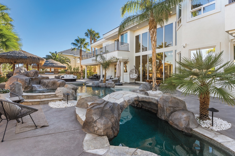 This two-story, 5,696-square-foot home, on a cul-de-sac in a private, gated community and listed by Ben and Natalia Harris of Las Vegas Sotheby’s International, impresses inside and out, featuring four bedrooms, four bathrooms and a three-car garage—not to mention full Strip views.