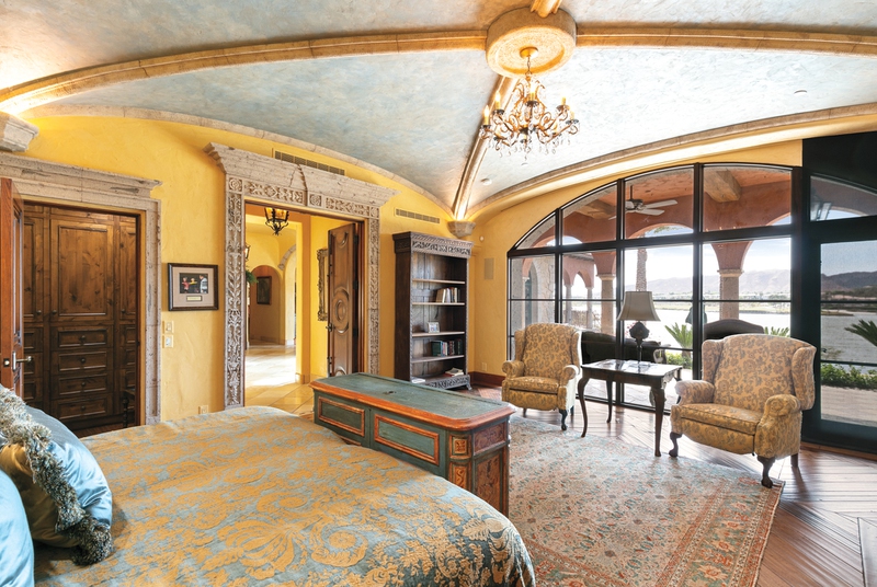 This 8,754-square-foot, two-story mansion, listed by Ivan Sher of IS LUXURY, has plenty of space for the largest of families—four bedrooms, nine bathrooms and a four-car garage. It’s a truly custom-built house, full of character through and through, from the chandelier and ornate archways to the large wooden beams on the ceilings and ascending stone staircase with wrought-iron railings. At its top, columns lead up to a muraled ceiling. It contrasts beautifully with the surrounding hardwood and stone flooring.