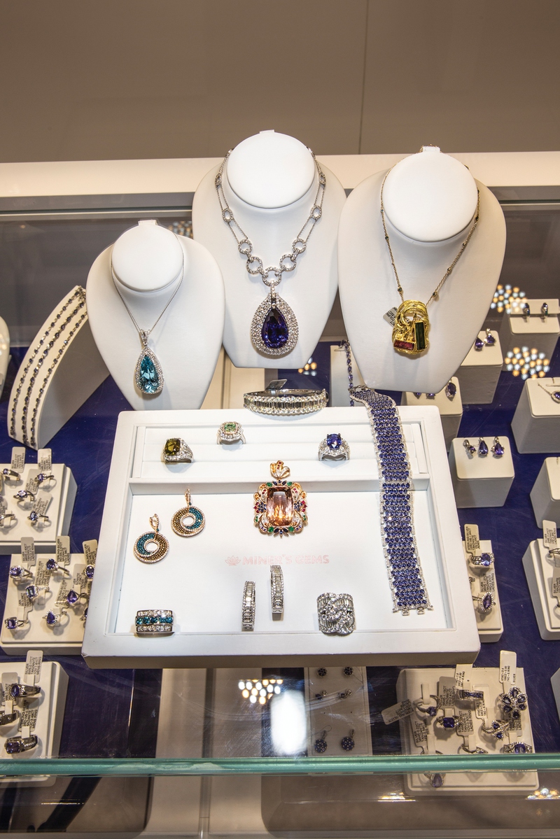 Some of Jethani’s favorite pieces (pictured) include a light blue natural aquamarine necklace, with diamonds set in 14-carat white gold; a 100-carat tanzanite necklace with diamonds all around; a hand-fabricated gold tourmaline set in 18-carat gold that can be used as a pendant or pin; a tanzanite and diamond bracelet; an 18.24-carat royal blue sapphire ring set in 18-carat gold with custom-cut trapezoid and half-moon stones; a natural green diamond ring (a very, very rare diamond); a diamond bracelet with emerald and round cut diamonds; a gold necklace with morganite, rubies, emeralds, sapphires and diamonds; in-house designed blue and brown diamond earrings; a 10-carat baguette and round diamond ring with matching earrings; and a blue and white diamond ring for men.