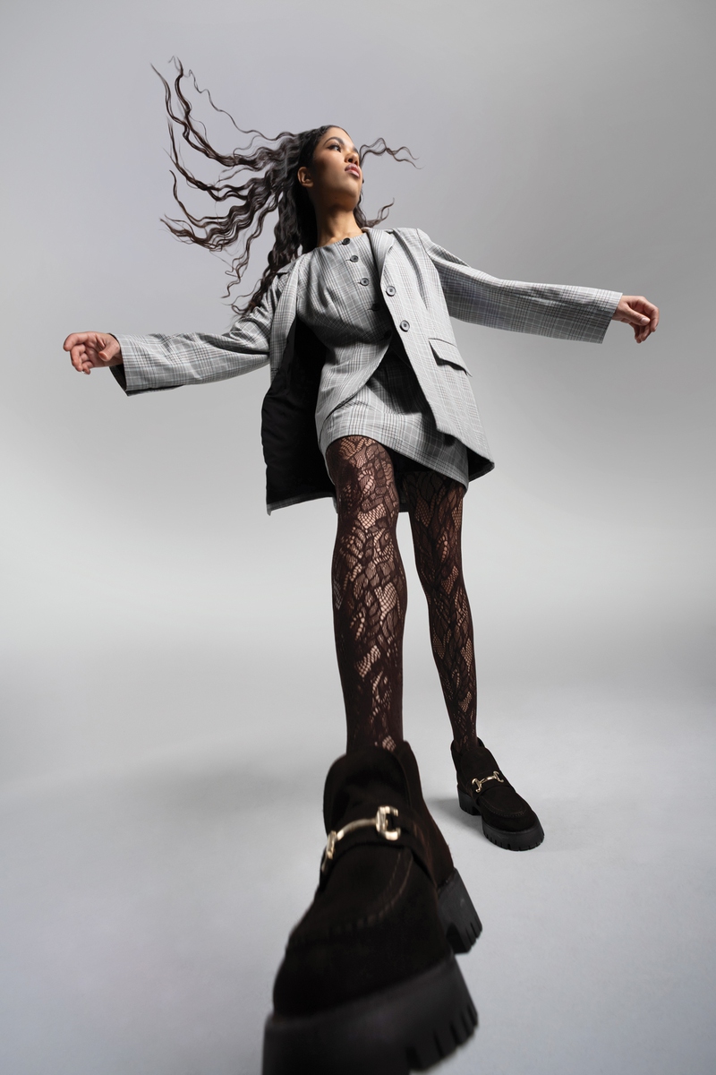 Eryn: GUESS Camille plaid vest ($118), Camille plaid blazer ($158) and Sadaya mini belted plaid skirt ($189), Steve Madden Leon shoe ($119.95), Calzedonia floral lace tights ($3