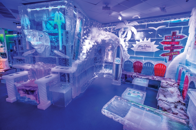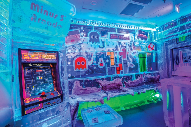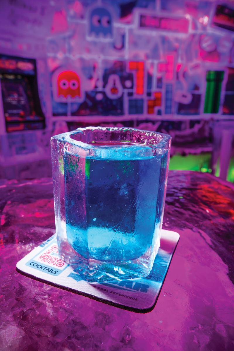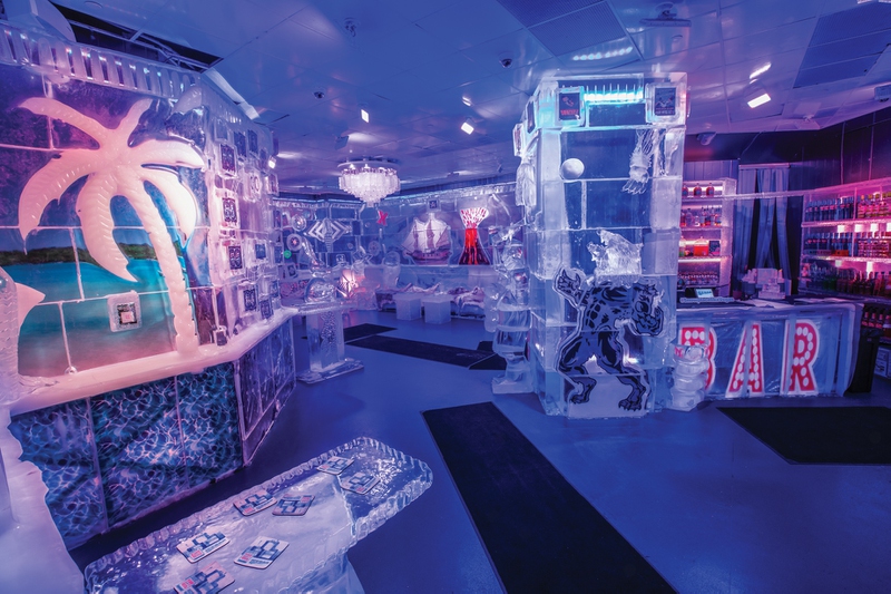 This location is the longest running of all three locations, opened in 2008. When you first walk in, you’ll discover an ode to the Arctic, with pictures set in ice of animals and scenery native to that part of the world. As you explore, check out the re-creation of the Zoltar Speaks game, made completely of ice, from the movie Big. There is a section tucked away that takes guests under the sea with floating jellyfish everywhere. There is a Viking ship you can sit in, decorated with Viking swords and flags. Take a pic while sitting on a throne made of ice with a giant bear carved into it. And the coolest feature of this Icebar is the new vintage arcade section with images of old-school games, Nintendo controllers and an actual video arcade machine set in ice, on which you can play games like Pac-Man, Space Invaders and Dig Dug.