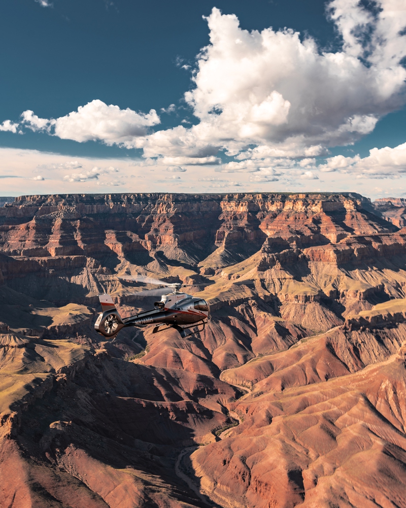 About 45 minutes in, the ground begins to fracture into ridges and shadows, and then the Grand Canyon opens before us—what Seth calls “the big reveal”—a sweep of color and space so expansive that conversation comes to a complete halt. The helicopter traces a path through more than 10 miles of canyon walls, their reds and browns deepening in the late-day light.