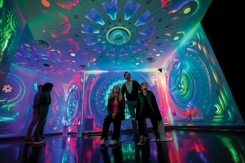 Parents with kids in tow navigate differently than college friends on a weekend trip, who move differently than couples on date night. The kids want the slides and the climbing walls. The college crew gravitates toward the hidden bar Datamosh, where Happle Juice flows and bartenders mix otherworldly cocktails. The date-nighters linger in installations like Claudia Bueno’s “Pulse,” where countless line drawings animate across 60 glass panels, the kind of mesmerizing art that gives you an excuse to stand close.