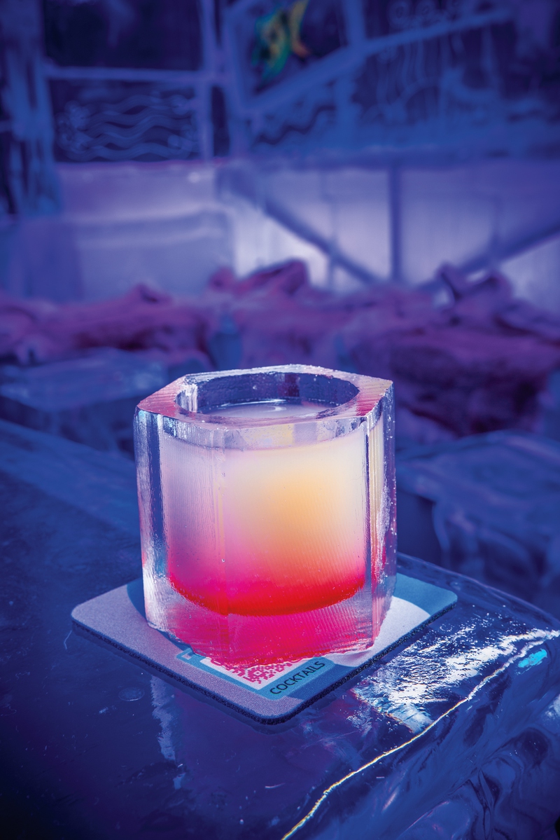 Yes, even the glass that your cocktail is served in is made completely of ice! It really is awesome—your drink gets colder and colder as you sip on it, and it never gets watered down. Try one of the most popular menu picks at Minus5, the Arctic Sunset. This specialty cocktail is made with Bacardi Dragonberry rum, pineapple juice, grenadine and Sprite.