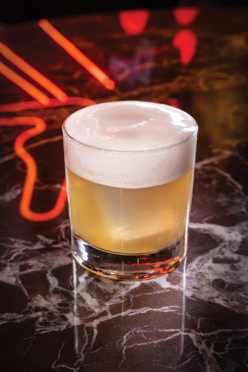 Think of this signature cocktail as a mix of two popular ones—a Penicillin meets a New York sour. It’s slightly sweet and slightly spicy and is well-balanced with rye, ginger, yuzu, celery bitters and a sweet-and-smoky blueberry peat foam.
