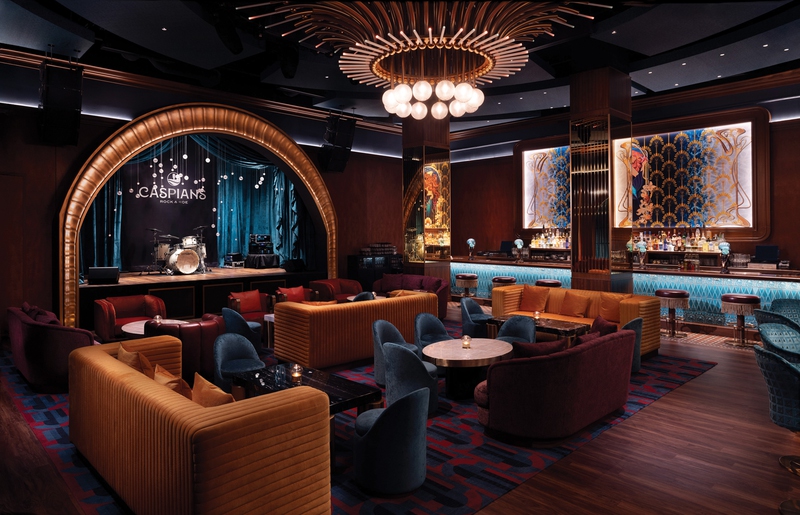 “Caspian’s is a picturesque caviar bar in the front—we like to say, ‘Business in the front, party in the back,’” says Ryan Brunty, director of marketing for Caspian’s. “You experience this luxe food in the front lounge, and then hidden behind a picture of a captain is the door to an art deco-styled rock ’n’ roll club. The difference between the two is so striking; it makes it such a fun, memorable experience for people.”