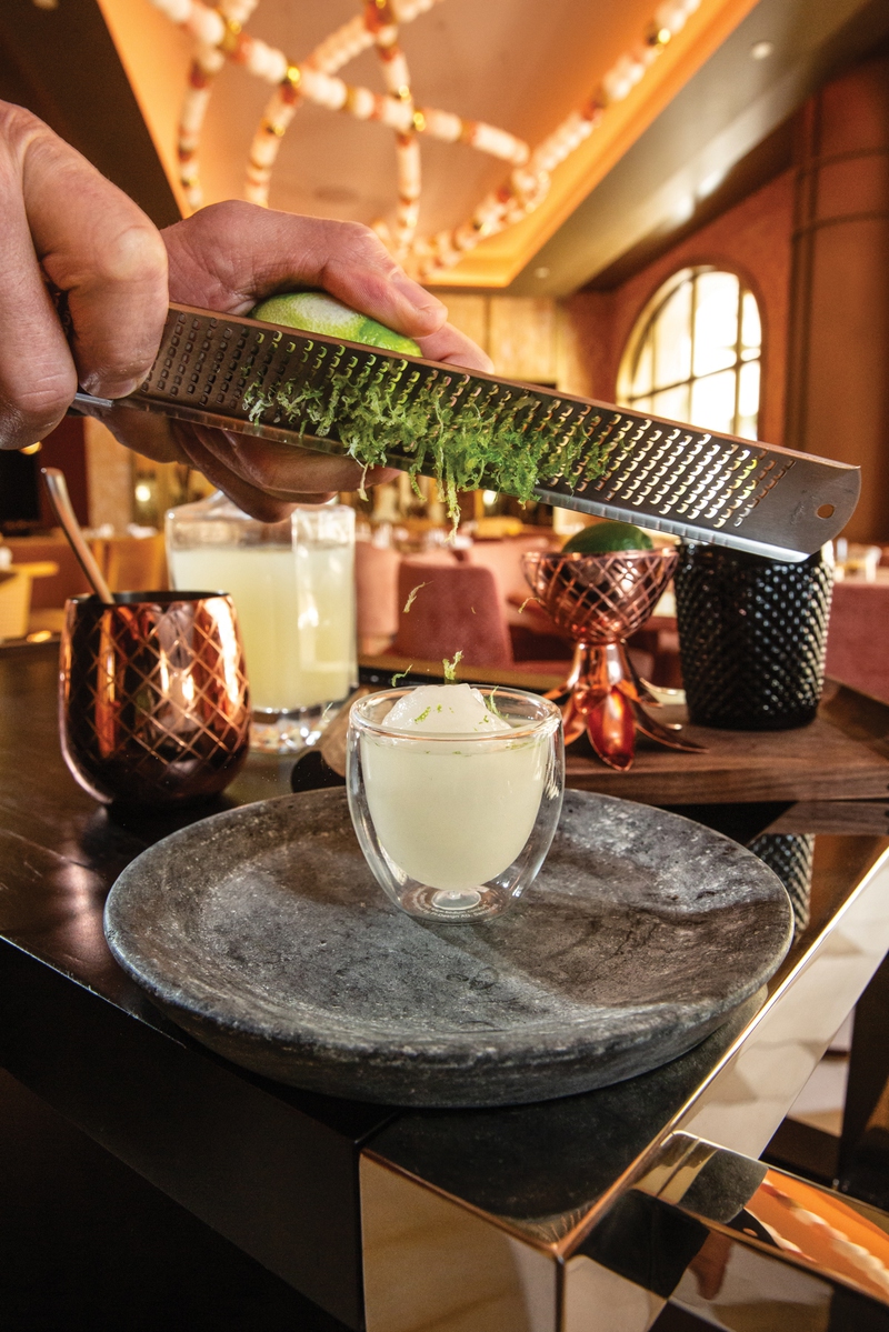 For another showstopping cocktail, heads will turn again when the Nitro Caipirinha cart is wheeled to the table. The prebatched Avuá cachaça caipirinha is added to a steel bowl along with liquid nitrogen. The mixologist then stirs the two together until a sorbetlike consistency is achieved and then piles the mixture into a glass and tops with some fresh lime zest. “This is all about having a cocktail in another form,” Gorham says.